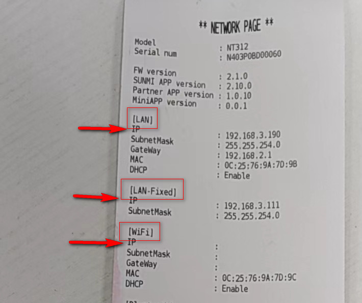 1. Tuplaklikkaa painiketta tulostimen pohjassa. Tulostin ilmoittaa ääneen ”Network self-checking, please wait” ja tulostaa testikuittin, josta saat sen IP-osoitteen